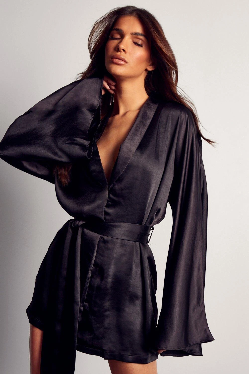 Premium Satin Kimono Sleeve Wrap Blazer Dress