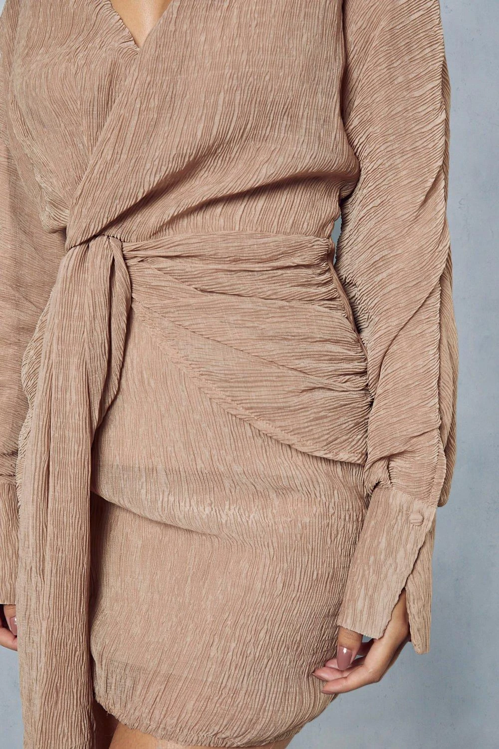 Textured Crinkle Twist Front Plunge Shirt Dress